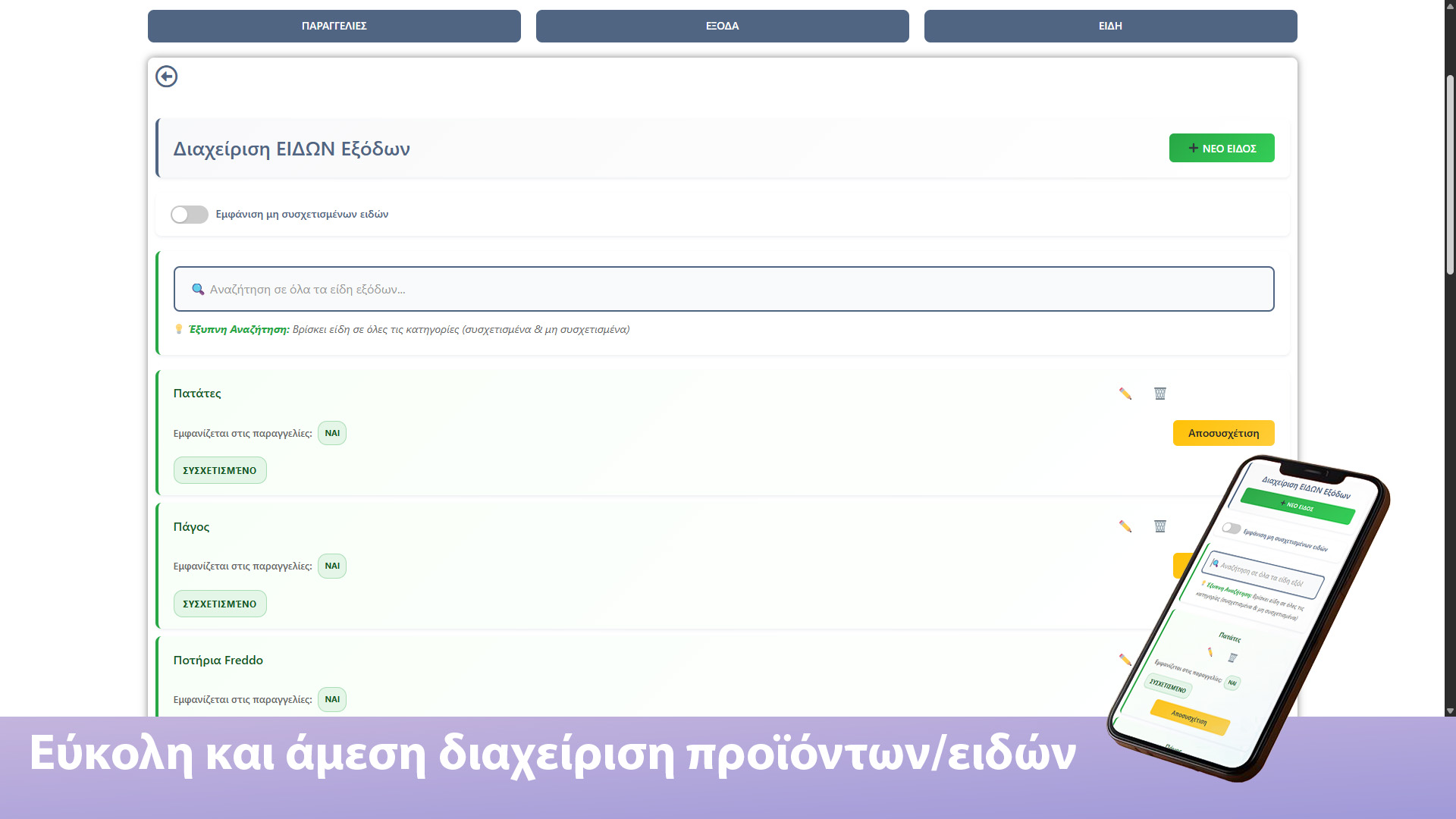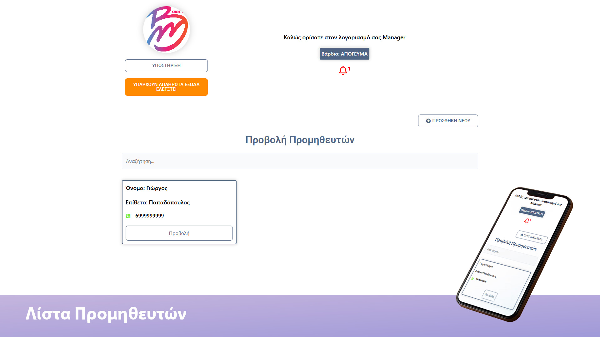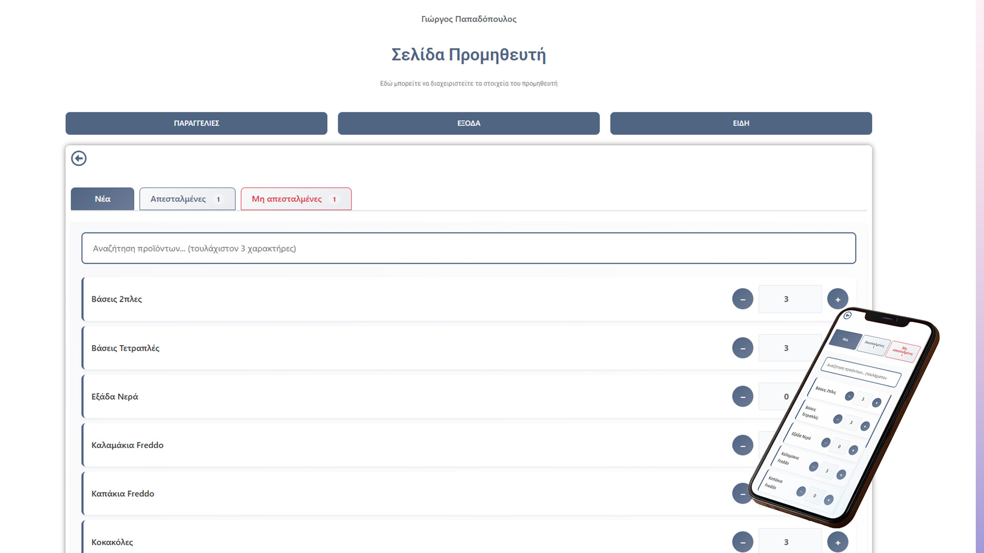 Έχετε την δυνατότητα καταχώρησης προμηθευτών με ακριβή αναζήτηση ονόματος και τηλεφώνου επικοινωνίας. Μπορείτε να διαχειριστείτε τους προμηθευτές σας, να παραγγείλετε άμεσα μέσα από την πλατφόρμα αποφεύγοντας viber και μηνύματα και να διαχειριστείτε τα είδη του προμηθευτή!
