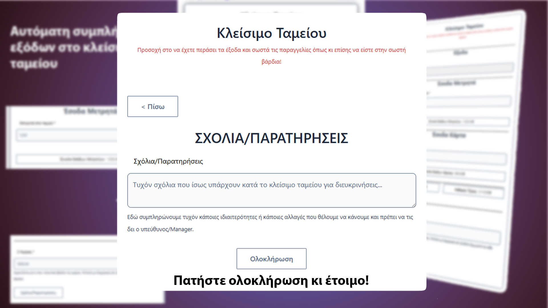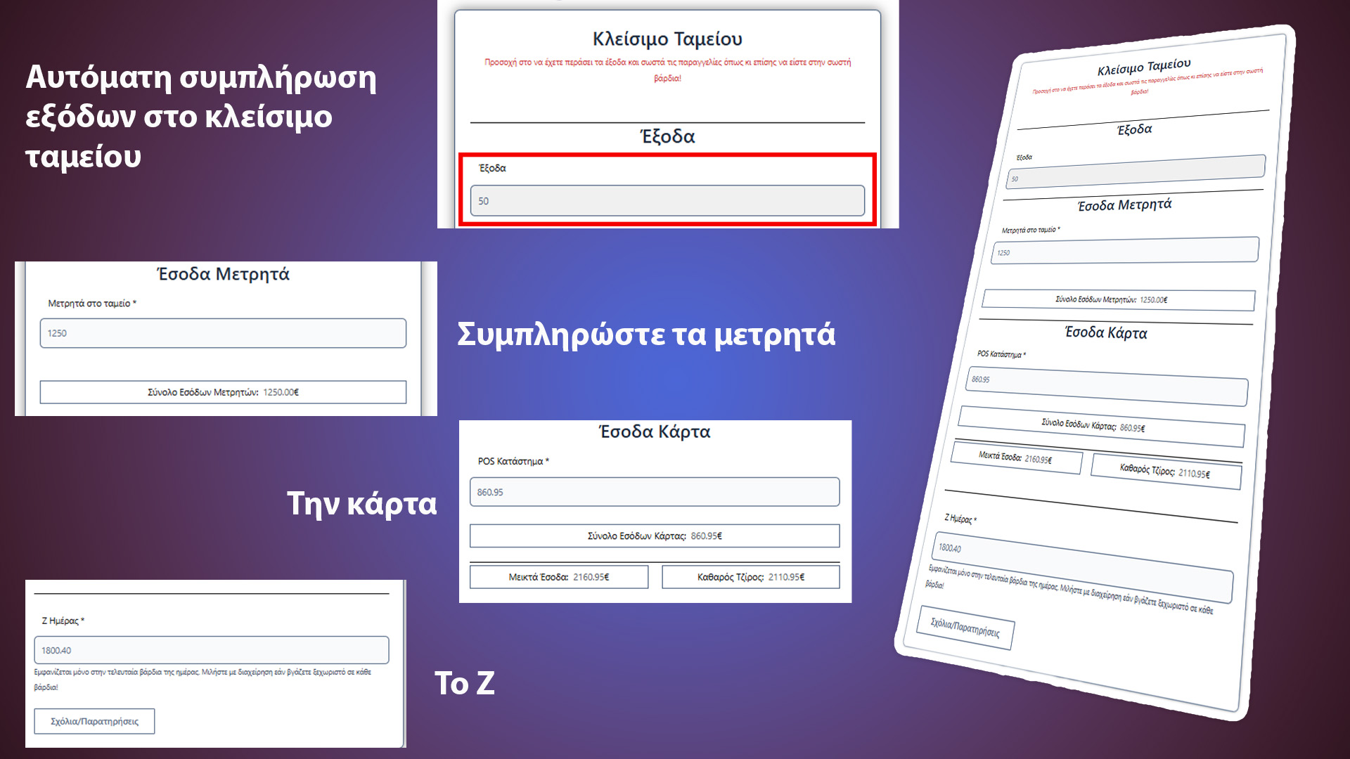 Εύκολο και γρήγορο κλείσιμο ταμείου σε απλά βήματα. Ξεχάστε χαρτάκια τα οποία μετά θα πρέπει να τα συλλέξετε και με τις ώρες να τα γράψετε στο τετράδιό σας ή σε excel! Έχετε άμεση εικόνα του πότε και ποιός έκλεισε ταμείο με αναλυτική εικόνα τζίρου, και εξόδων της ημέρας!