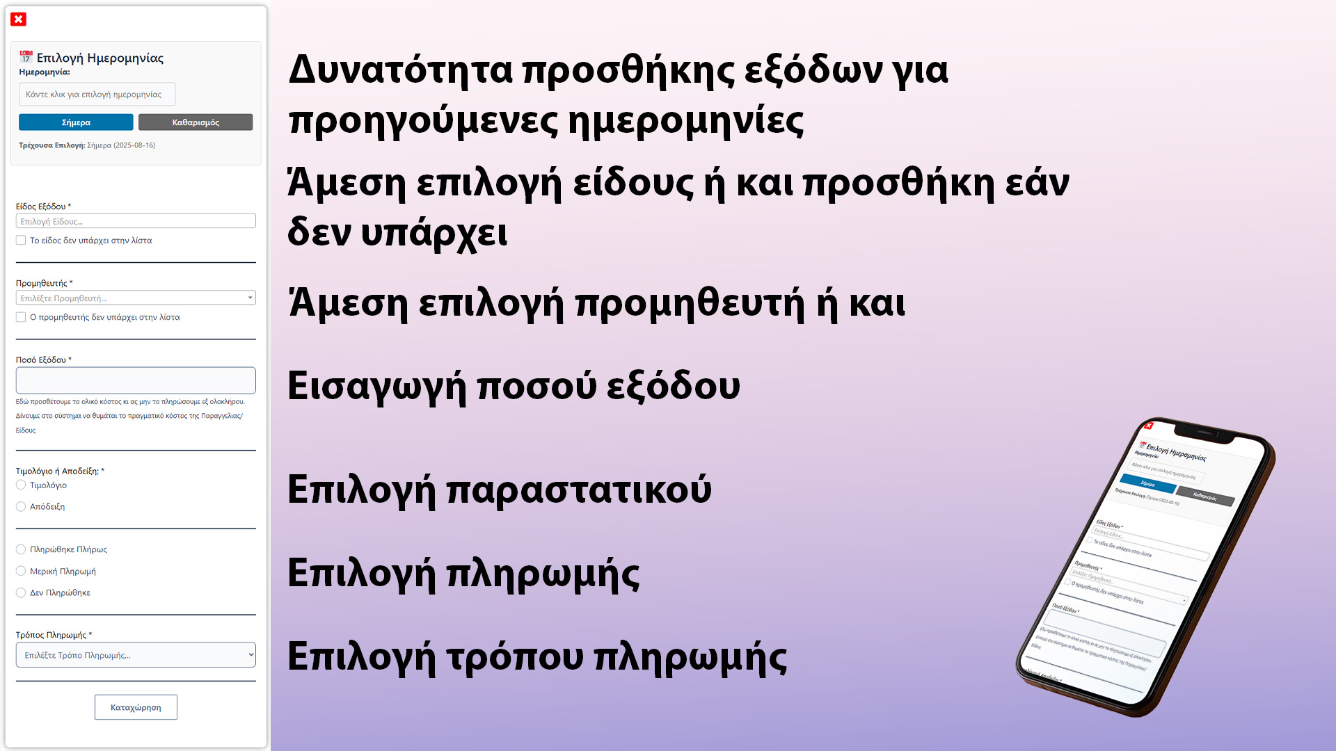 Εύκολη καταχώρηση εξόδων με έξυπνη λειτουργία κατάστασης ενημερώνοντάς σας άμεσα για την πληρωμή του εξόδου. Πληρώθηκε πλήρως; Έγινε μερική πληρωμή; Δεν πληρώθηκε καθόλου; Τα θυμάται όλα για εσάς!